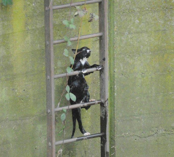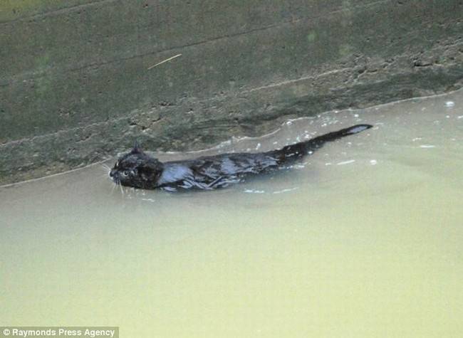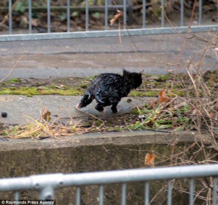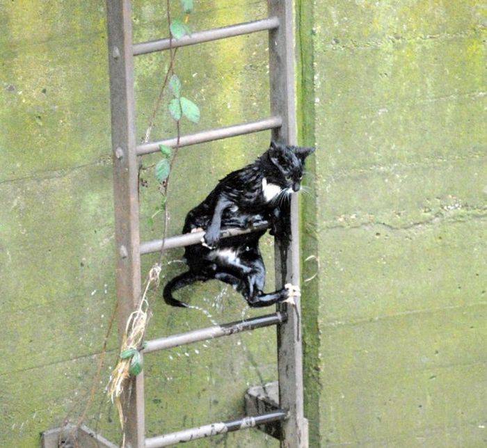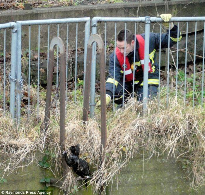 Малыша смыло в реку, но на сушу выбраться он сумел. Осталось вот только забраться наверх... Пожарные, которых вызвали очевидцы, опоздали. Котенок уже выбрался сам