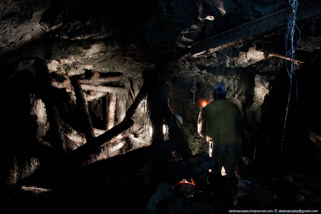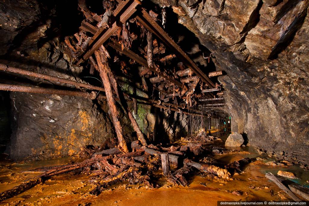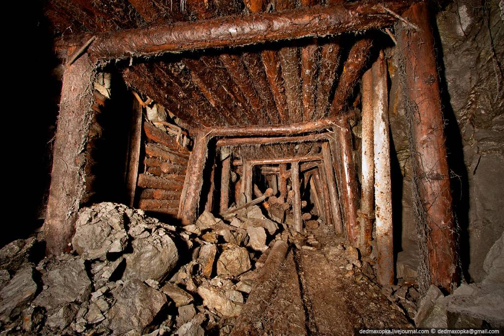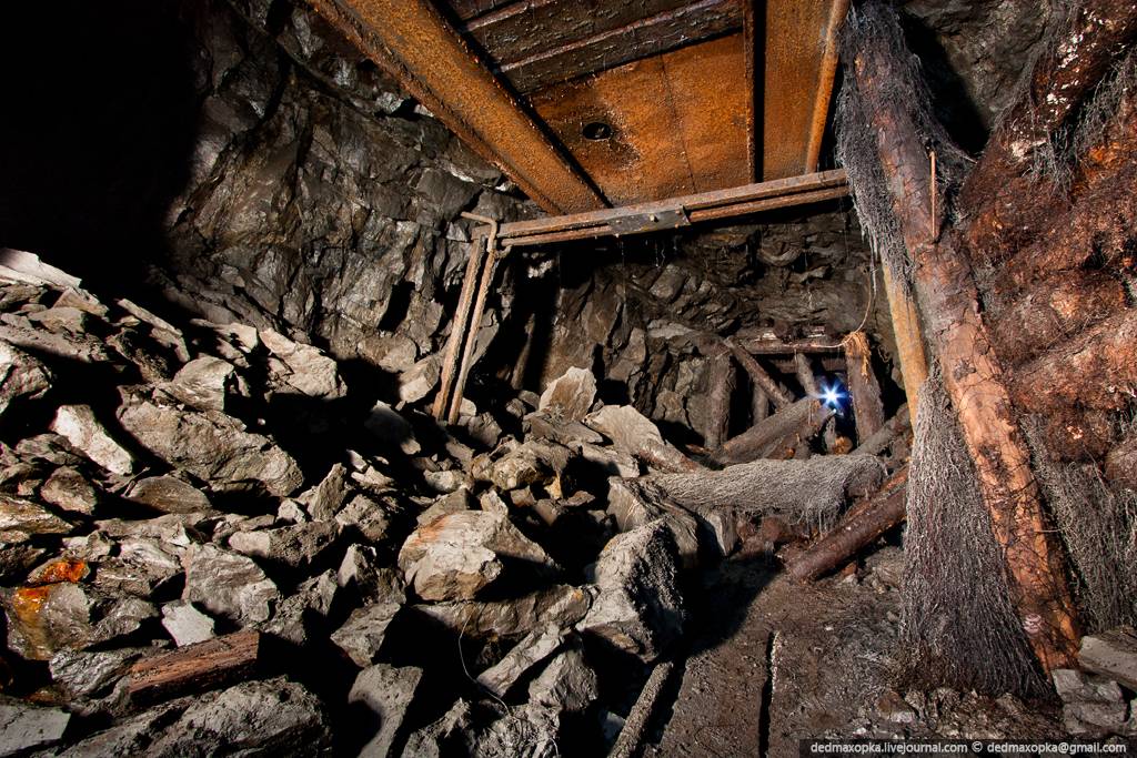 Буквально сразу стало понятно, что шахта в плохом состоянии. Слишком много обвалов, рельсы ржавые, деревянные опоры готовы вот-вот рухнуть, стоит только их задеть. Пробираясь через камни, мы шли дальше.