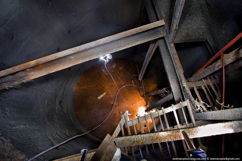 Приехав к месту, облачившись в костюмы хим.защиты, спрятав ценные вещи в гермомешки, мы увидели бетонные развалины копра. Довольно быстро нашли дыру в земле, ведующую в подходняк к вентиляционному стволу, на котором красовалась стальная "пробка".