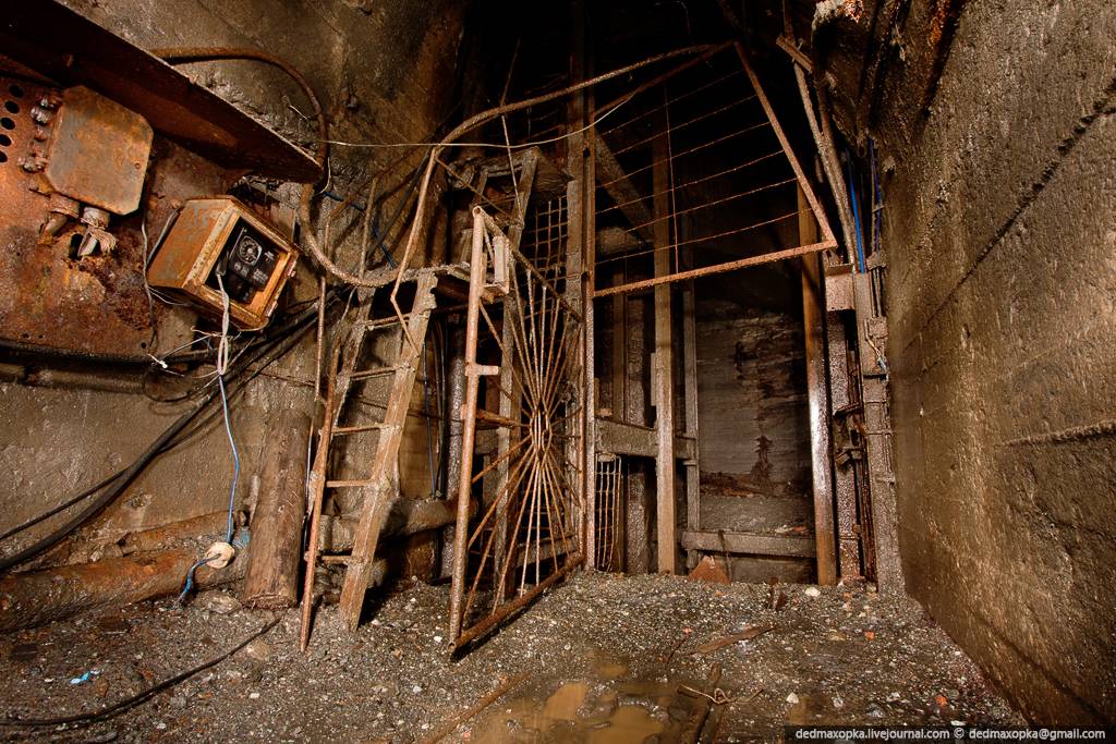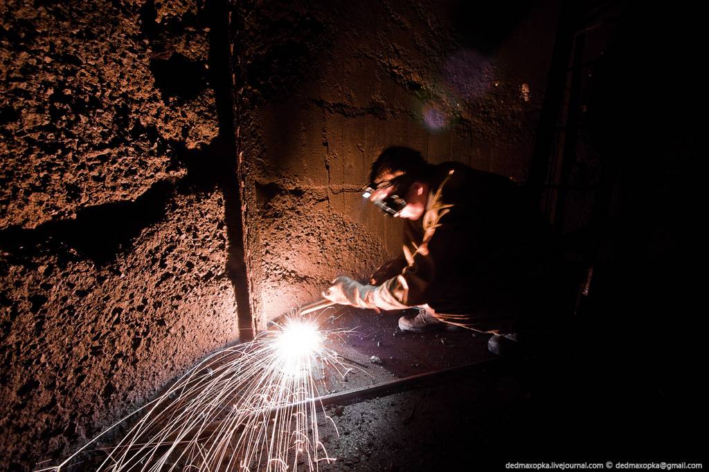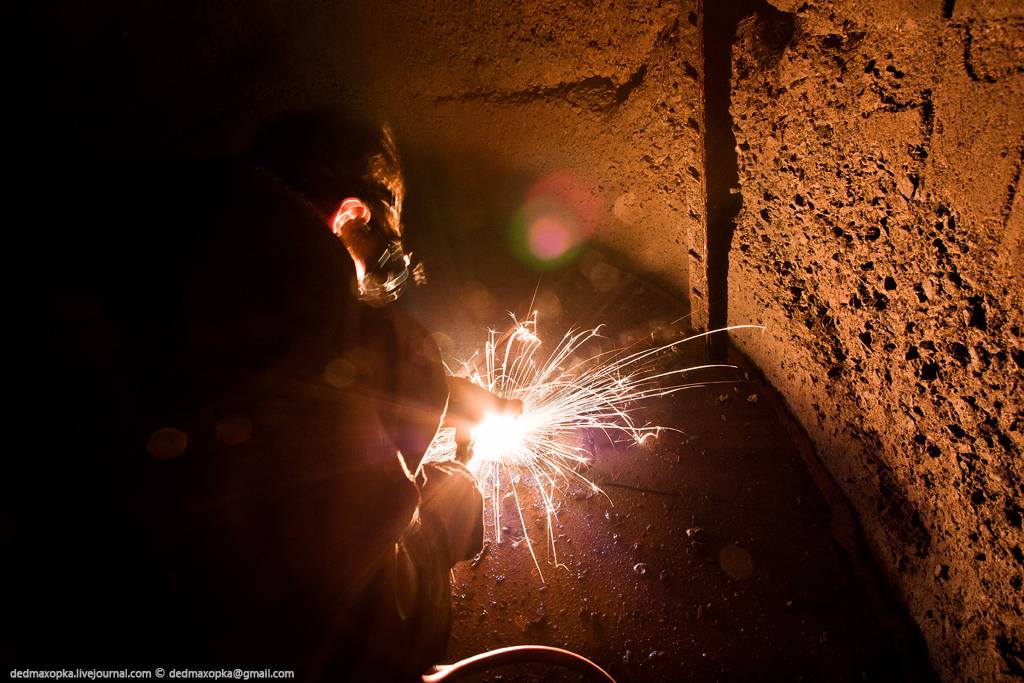 После пары кадров мы начали долгий и нудный спуск вниз. Чем глубже, тем влажность выше, начинают лить ливни грунтовых вод, которые норовят промочить тебя насквозь. Именно для того, чтобы не промокнуть нужна хим.защита. Площадка за площадкой вниз, железо вокруг становится ржавым, а сетка рабица рассыпается в руках.